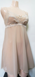 思い出の中にある、やさしさのようなふんわり軽いジョーゼットに光った落下版のストレッチレースをあしらったスリップ スカートはフレーアーになっています。ナイトウェアーとしてもお召しになれます。サイズM(バスト79-87)